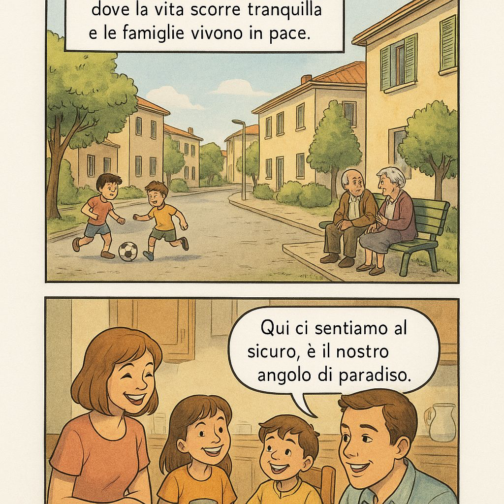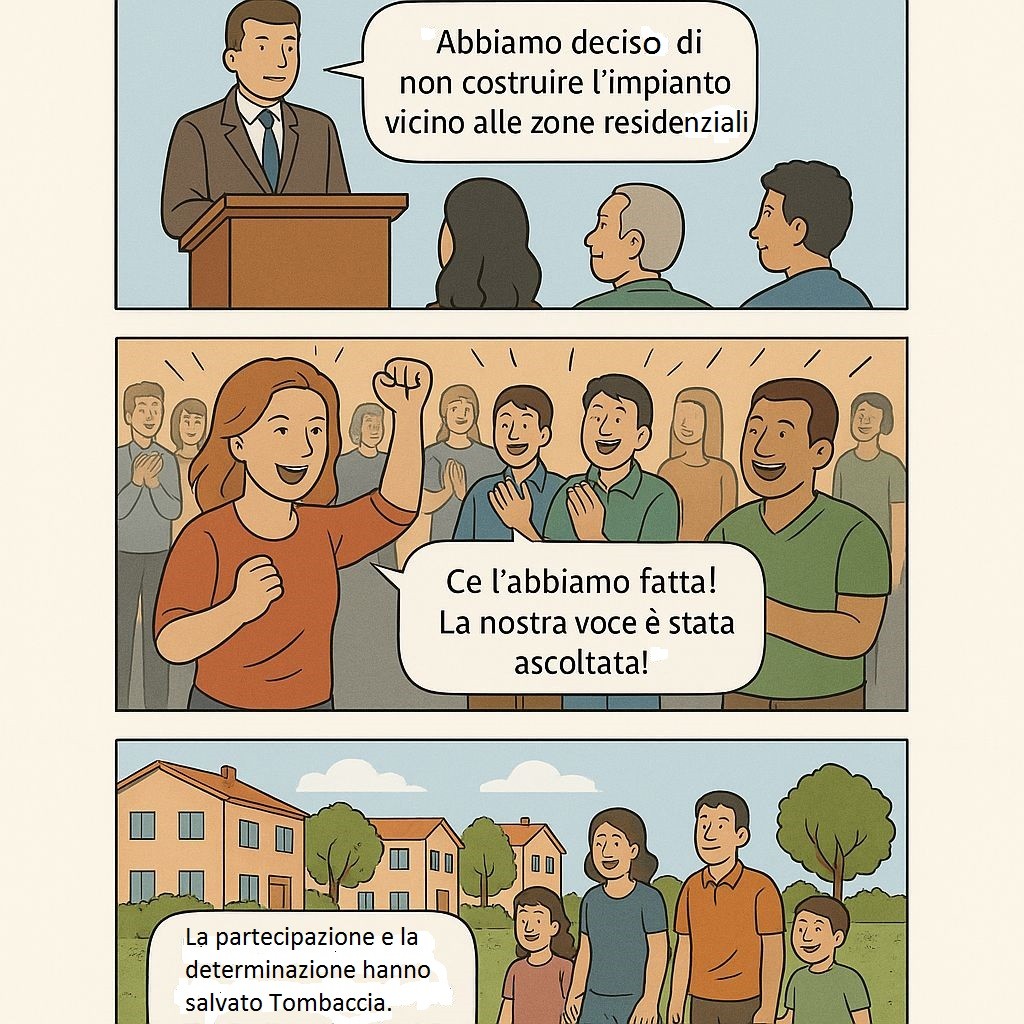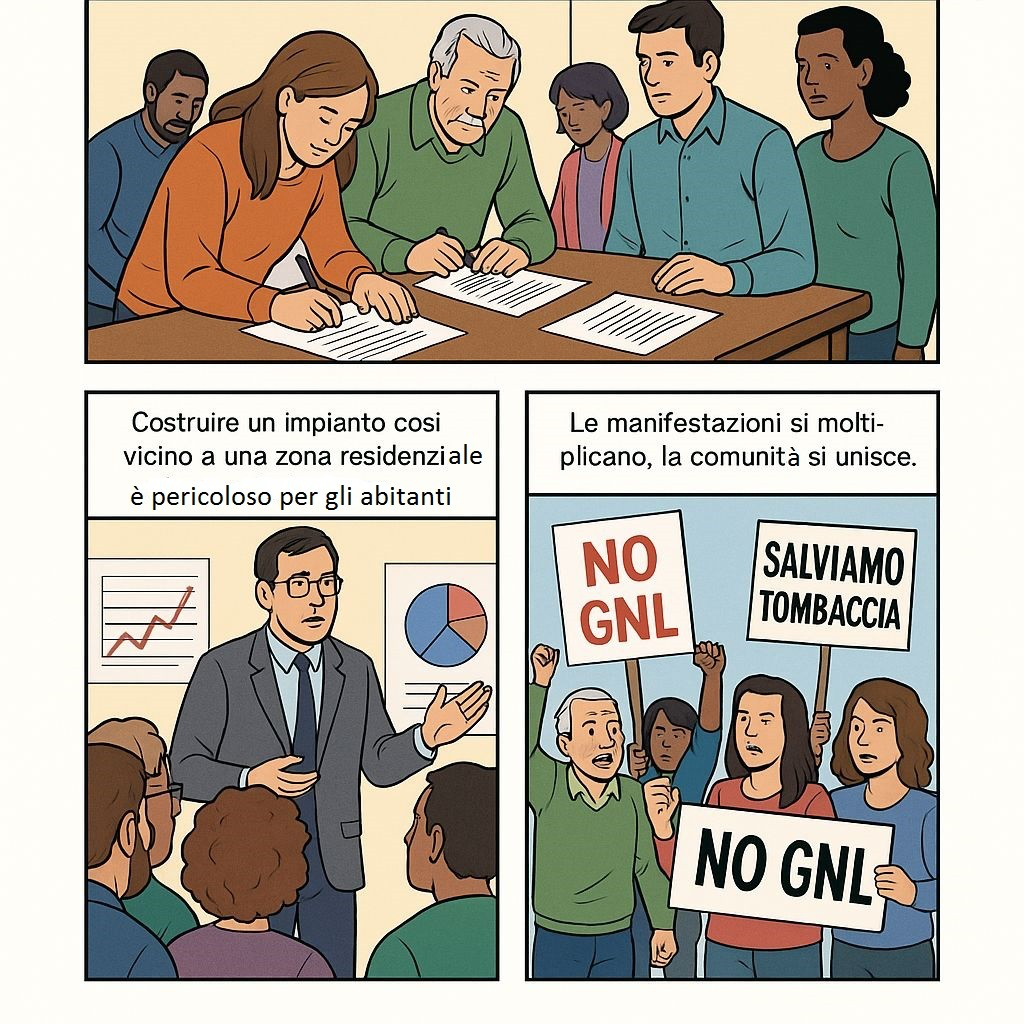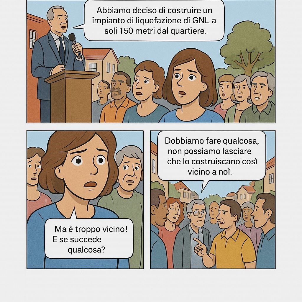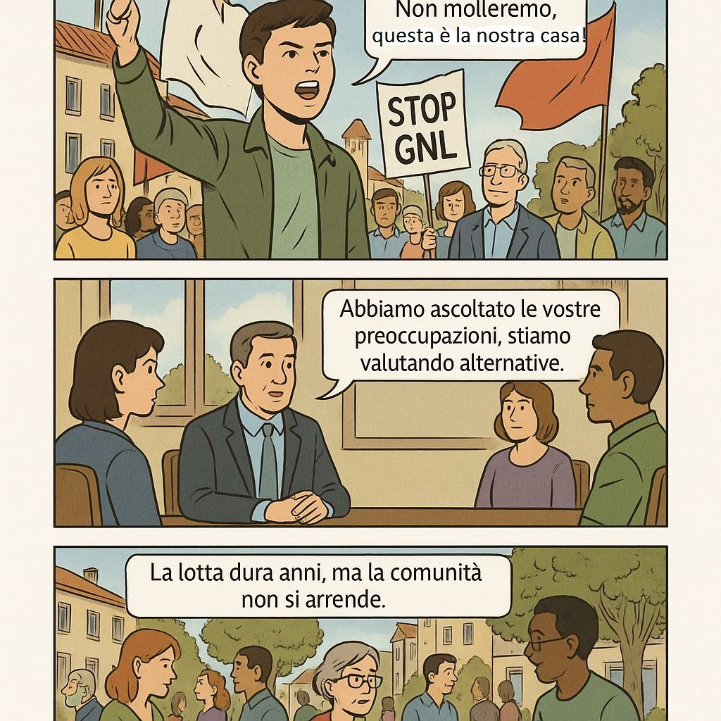 Il racconto parte da una scena serena di vita quotidiana: bambini che giocano, anziani che chiacchierano, famiglie riunite in un quartiere che è descritto come “un angolo di paradiso”. L’annuncio dell’impianto di liquefazione del gas naturale a 150 metri dalle case rompe l’equilibrio e getta i cittadini nello sconcerto. Ma la favola non si chiude in toni cupi: al contrario, i protagonisti si uniscono, si informano, scrivono appelli e ricorsi. Alla fine, come nelle migliori storie, vince la comunità, e l’azienda stessa ritira il progetto, riconoscendo la forza e la ragione della cittadinanza.