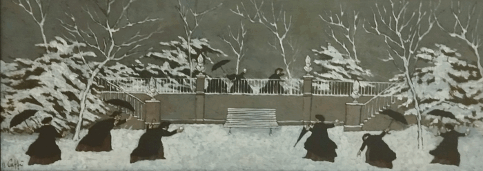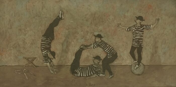 La mostra Nino Caffè. Tra naturalismo e satira, allestita nella nuova ala dei Musei Civici di Palazzo Mosca e curata da Mariastella Margozzi, raccoglie 65 opere provenienti da collezioni private e dagli eredi. È un percorso che abbraccia quarant’anni di attività, dai paesaggi e ritratti – compresa una rara natura morta – fino al corpus centrale dedicato al clero in chiave satirica. I “pretini” sono qui nelle loro molteplici varianti iconografiche, immersi in scenari urbani o naturali, tra sogni e piccoli drammi quotidiani. Ma non tragga in inganno il loro aspetto caricaturale, perché oltre – e sotto – le loro vesti si nascondono gli archetipi del Bene e del Male, come emerge, per esempio, nella sua drammatica “Apocalisse” del 1959 (Collezione Elio Giuliani).