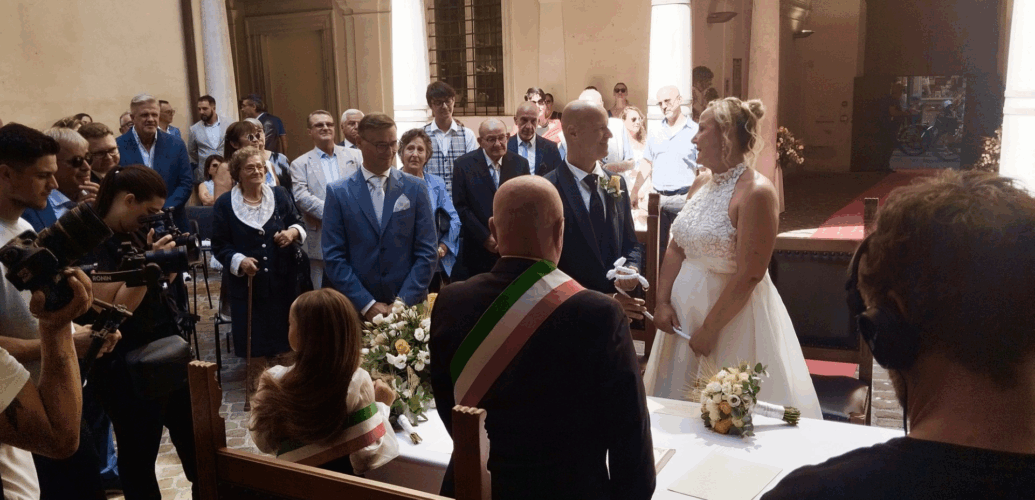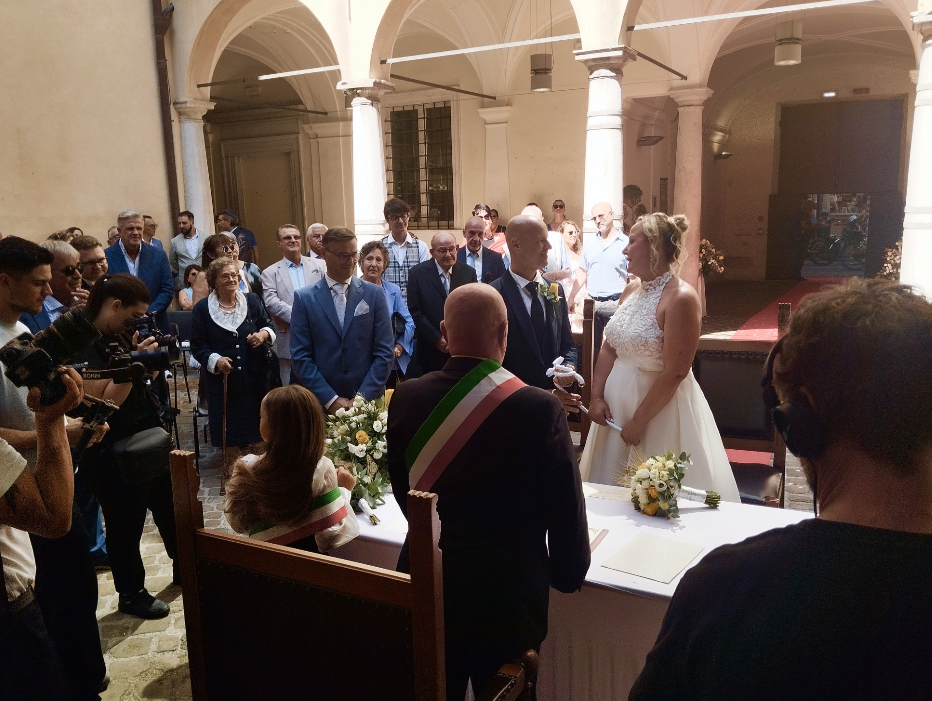 La cerimonia si è svolta nello scrigno rinascimentale di Palazzo Gradari, tra le arcate e i loggiati illuminati a festa. Un momento tutt’altro che formale in cui gli sposi hanno espresso il loro amore con promesse che hanno commosso gli intervenuti per la loro spontanea sincerità.