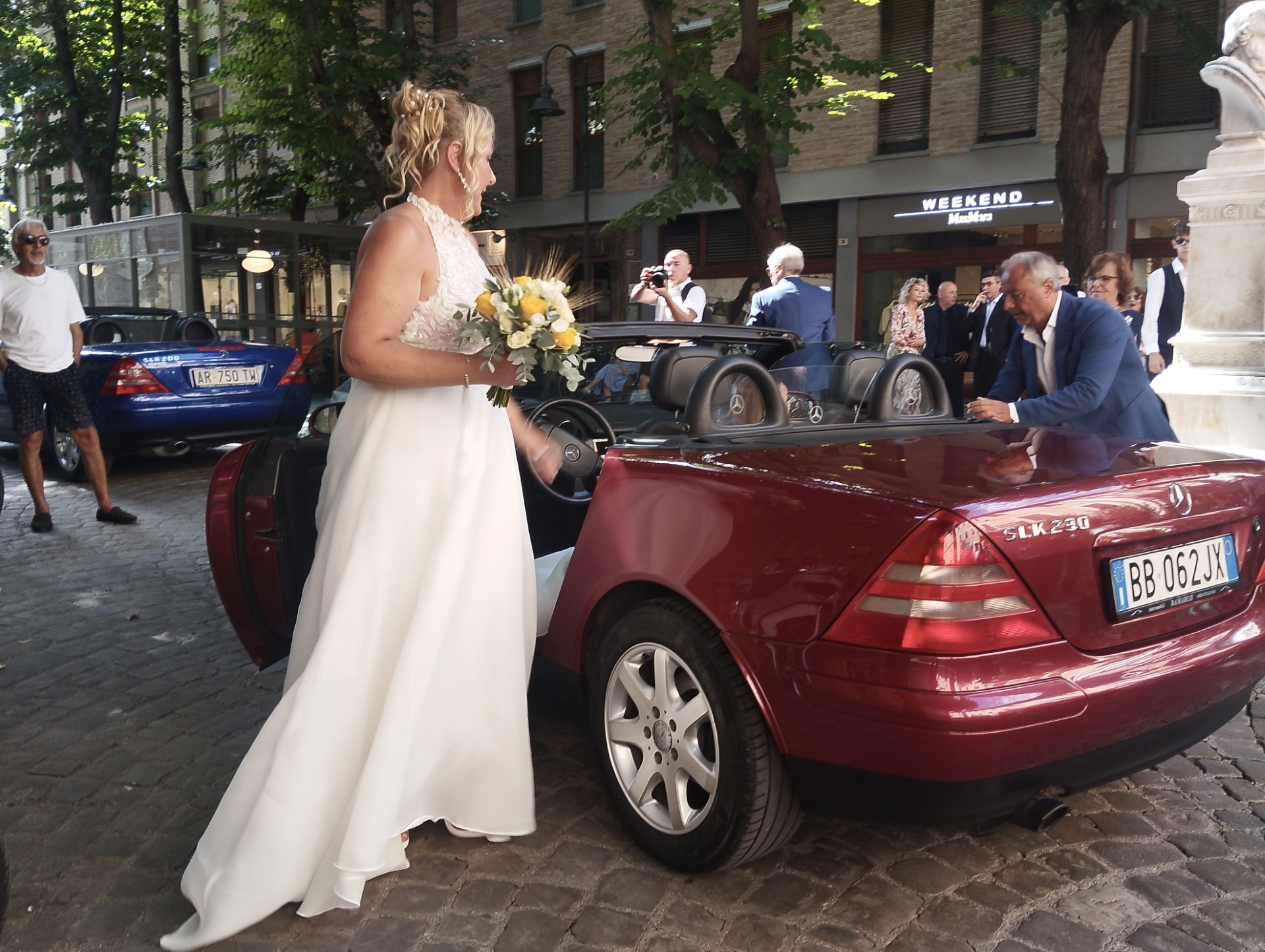 Il cuore della città, piazzale Collenuccio, si è trasformato in un punto di incontro vivace, dove parenti, amici e numerosi cittadini hanno atteso con trepidazione l’arrivo degli sposi. Fausto è giunto per primo, accolto da sorrisi e abbracci, seguito poco dopo da Pia, che ha fatto il suo ingresso nel piazzale a bordo di una Mercedes-Benz SLK 230 Kompressor color rosso metallizzato intenso (magma red). Una spider che per gli appassionati di motori simboleggia energia e passione.